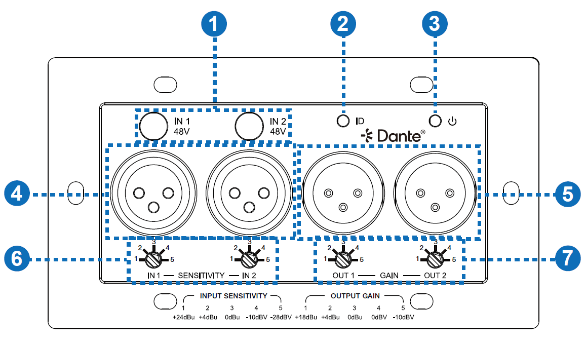 ① 1x 2x 入力 & 2x 出力アナログ XLR - Dante® コンバーター